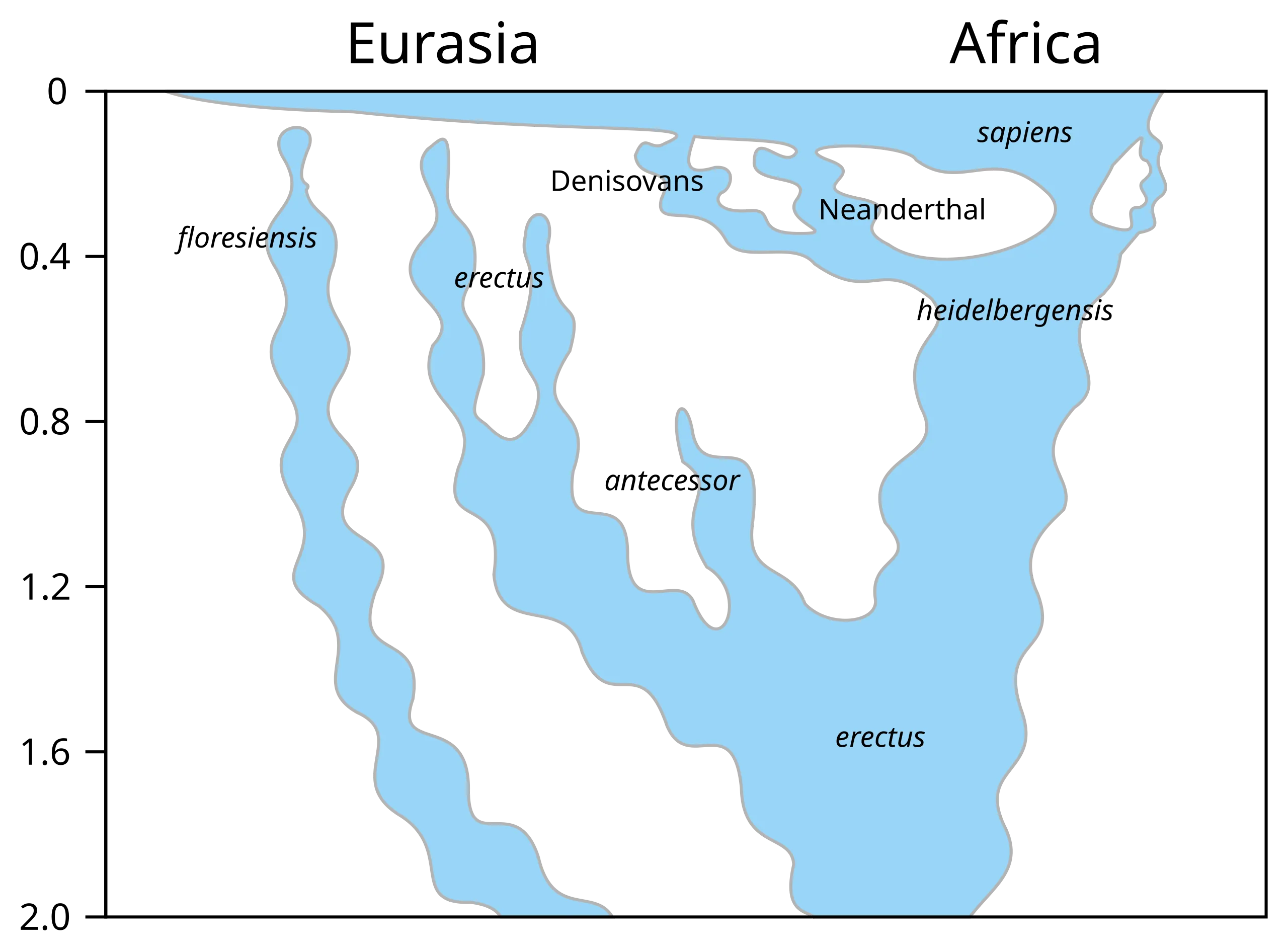 Grafen ovan visar de olika arternas geografiska spridning och hur länge de existerat. Notera hur länge Homo erectus existerade och hur flera grenar går in i Homo sapiens.