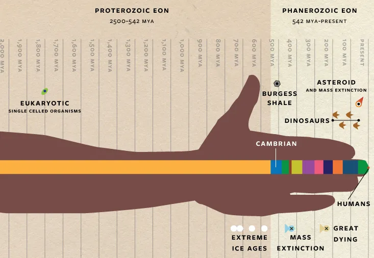 En visualisering av jordens historia längs med en mänsklig arm. Hela mänsklighetens historia ryms på den yttersta kanten av långfingernageln.